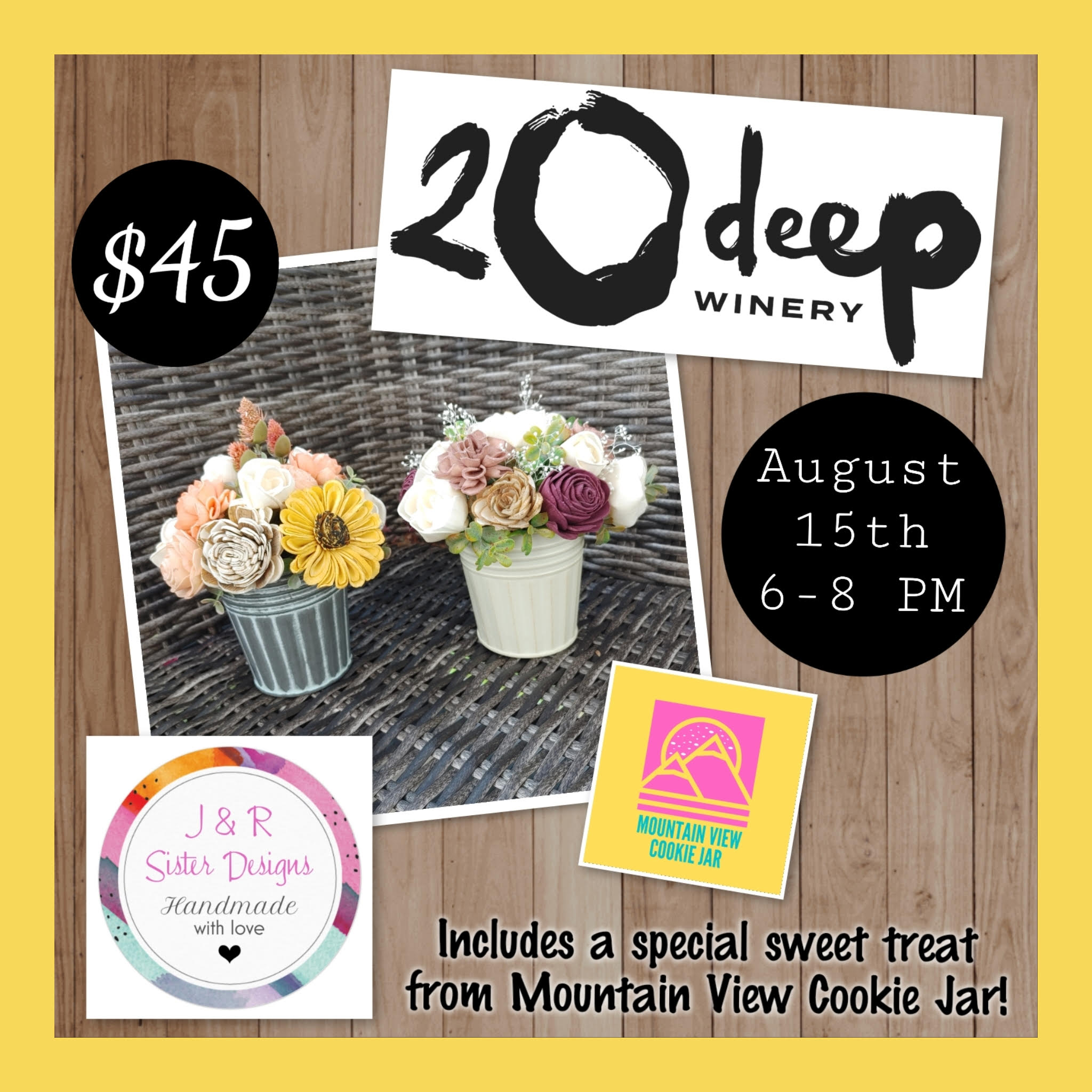 Dive into a delightful evening of creativity at 20 Deep Winery! Join us on Thursday, August 15th, from 6pm-8pm for a special “Make Your Own Wood Flower Arrangement” class presented by J&R Sister Designs. Each participant will craft a unique bouquet by selecting from an array of flowers and greenery. With step-by-step instructions, you’ll paint and arrange your assortment, resulting in a one-of-a-kind creation! Each ticket also includes a special sweet treat from Mountain View Cookie Jar!